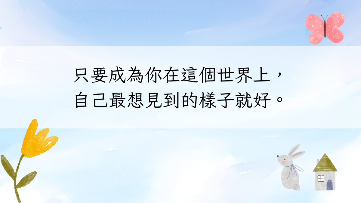 正因為自己走過這個歷程,在這次的工作坊,我想傳遞給大家的是:「從自己開始,不需要再去背負他人的期待,只要成為你在這個世界上,自己最想見到的樣子就好。」